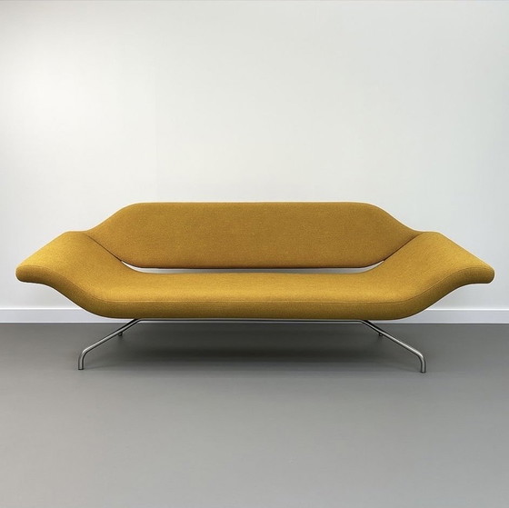 Le canapé Artifort Ondo est un canapé confortable composé d'une ligne fluide allant d'une main courante à l'autre. La forme du canapé semble être basée sur une bouche et des lèvres. La base mince et minimaliste donne l'impression que le dossier et l'assise flottent. La construction de haute qualité garantit un grand confort d'assise et une longue durée de vie. Les accoudoirs, le dossier et l'assise sont constitués d'une seule pièce de mousse moulée. Ce canapé attire tous les regards et convient parfaitement à l'aménagement d'un projet, d'un bureau ou d'une maison.