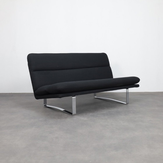 Le C683 se distingue par son dossier élégamment incliné et son assise généreusement rembourrée, créant une silhouette à la fois décontractée et rigoureuse. Revêtu de laine noire profonde, le canapé dégage une présence apaisante et tactile qui contraste harmonieusement avec son piètement sculptural en acier inoxydable. Les pieds en métal poli surélèvent légèrement le canapé, lui conférant une impression de légèreté et soulignant son caractère architectural. De subtiles surpiqûres horizontales sur le dossier rythment et structurent l'ensemble, témoignant du souci du détail et des proportions propres à Kho Liang Ie.