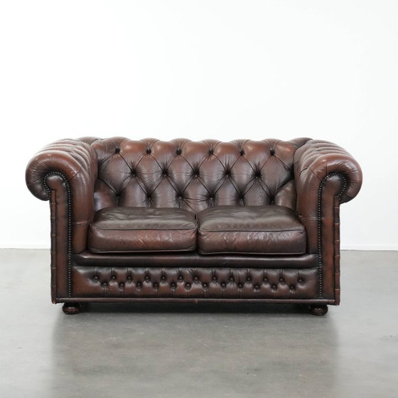 Canapé Chesterfield vintage 2 places en cuir de vachette marron foncé, de style anglais