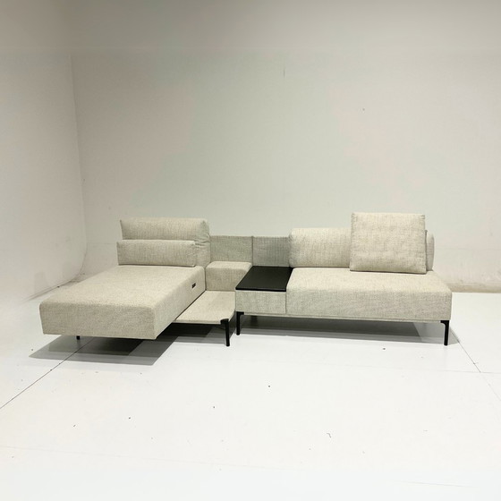 Canapé d'angle Indera Snooze - Comme neuf - Dimensions sans fonction relax : L 3,01 m x P côté droit 1,19 m x P côté gauche 0,93 m - Dimensions avec méridienne relax : L 3,01 m x P 1,59 m - Confort : relaxation optimale grâce au dossier réglable et à la fonction relax intégrée - Fonctionnalités : canapé high-tech avec module relax intégré et table d'appoint - Designer : Studio Segers - Description : Le Snooze d'Indera incarne le confort et le design modulaire. Ce canapé minimaliste avec méridienne allie lignes épurées, matériaux doux et fonctionnalités ingénieuses. La table d'appoint noire intégrée apporte structure et praticité, idéale pour un livre, un ordinateur portable ou une tasse de café. Le revêtement gris clair en tissu finement structuré crée une allure intemporelle et sereine. L'élégant piètement en métal noir allège visuellement le canapé, tandis que l'assise et les éléments réglables garantissent une relaxation absolue. Fonctionnalités : Le Snooze est doté d'une fonction relax électrique : le dossier et le repose-pieds de la partie gauche sont réglables grâce à un bouton discret sur le côté. Les dossiers sont réglables manuellement en position verticale pour un soutien optimal ou inclinés pour un confort maximal. Idéal pour une soirée détente, une sieste réparatrice ou un marathon Netflix. Signes d'usure et/ou dommages : Ce canapé Snooze est en excellent état et a été très peu utilisé. Aucun signe d'usure, tache ou décoloration n'est visible. La fonction relax fonctionne parfaitement et la table d'appoint est également comme neuve. Un chef-d'œuvre du design belge, prêt à sublimer votre intérieur.