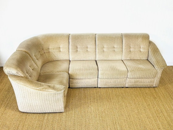 Canapé d'angle modulable en tissu côtelé beige (style velours chenillé) datant des années soixante au design rétro et aux lignes arrondies caractéristiques de l’époque.
