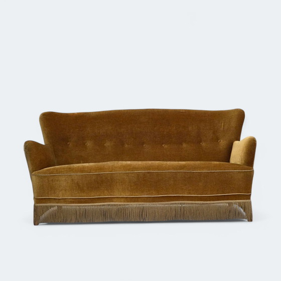 Canapé danois 3 places des années 1960. Velours d'ameublement jaune miel, pieds en hêtre, assise à ressorts. Très bon état d'origine : pas d'odeurs, pas de taches, et construction stable. Fabriqué par un fabricant de meubles danois vers 1960-65. Original Scandinavian craftsmanship vintage design directement du Danemark. Le canapé a été vérifié par un artisan.