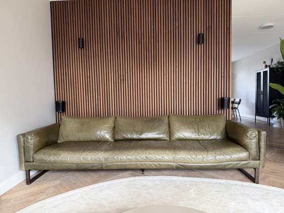 Le canapé d'appoint en cuir présente une allure élégante et robuste grâce à ses accoudoirs étroits et ses larges coussins. Il gagne ainsi en présence sans paraître massif. Ce canapé 4,5 places est confectionné en cuir aniline ouvert Massai, coloris Olive. Le cuir aniline naturel est teint dans la masse, directement dans la cuve, à l'aide de teintures aniline transparentes. La surface du cuir, à la structure ajourée, offre un toucher exceptionnellement doux et chaleureux. Caractéristiques : largeur 285 mm, largeur d'assise 243 mm, profondeur 94 mm. Piètement en bois fuselé de 19 cm de hauteur. Acheté chez Loods 5 au prix de 3 699 euros.