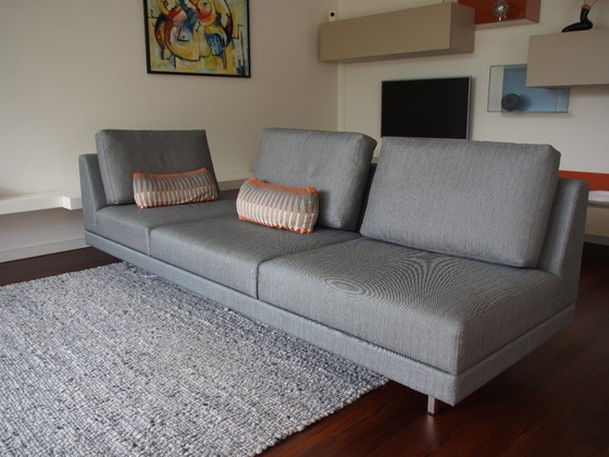 Ce banc design est très flexible dans son utilisation car les trois parties peuvent être tournées selon les besoins. Il peut très bien être placé au milieu d'une pièce pour une utilisation double face si nécessaire. Demandé et fabriqué sur mesure par Baan Meubelen en 2016. Beau tissu gris qui semble encore neuf (utilisé dans un ménage de 2 personnes sans enfants/animaux). Pieds en métal légèrement en retrait, ce qui donne l'impression que le canapé flotte. Largeur 270 x profondeur 90 cm. Hauteur d'assise 44 cm, profondeur d'assise 55 cm. Hauteur du dossier avec coussin d'environ 50 cm (ce qui permet de soutenir les épaules),