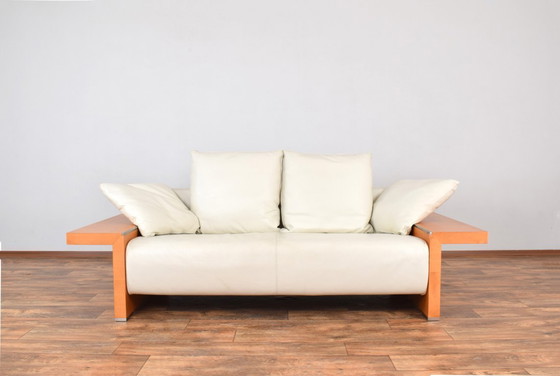 Ce canapé a été fabriqué dans les années 1980 par la célèbre maison italienne Giorgetti. L'assise et le dossier sont revêtus de cuir beige naturel d'origine, estampillé de la signature du fabricant. Les éléments en bois sont en merisier. Le canapé est en bon état d'origine, présentant quelques traces d'usage sous forme de rayures et d'éraflures sur le cuir et le bois. Chaque coussin et le dessous du canapé sont signés.