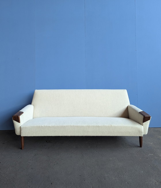 Magnifique canapé vintage des années 60, importé directement du Danemark. Ce canapé est dans son état d'origine, avec ses accoudoirs en teck et son revêtement en laine. Ses élégants pieds fuselés lui confèrent une allure exceptionnelle.