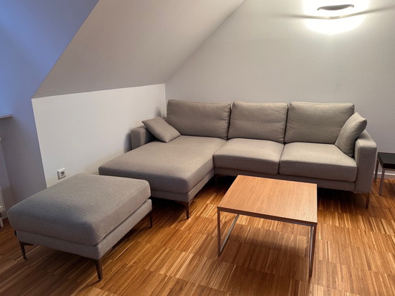 Découvrez un élégant canapé d'angle gris clair, accompagné de son pouf assorti, idéal pour sublimer tout espace de vie moderne. Ce meuble raffiné allie confort et style, offrant une solution d'assise polyvalente pour votre intérieur.
