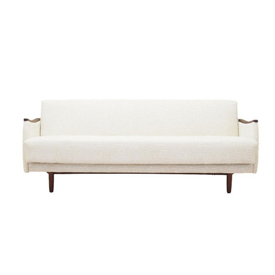 Le cadre est en bois massif. Les pieds et les accoudoirs sont en teck massif. Le canapé a été remis à neuf, avec une nouvelle mousse et un nouveau tissu. Le revêtement est de couleur écru et fait d'un tissu de haute qualité. Le canapé peut être transformé en un endroit confortable pour dormir.