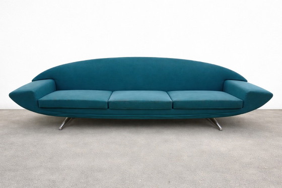 Canapé "Capri" du célèbre designer scandinave Johannes Andersen pour Trensum. Grand modèle 3 places, de forme courbe, en tissu bleu canard et piétement métal. Pièce rarissime car seulement produit en 1959, il n'en reste que quelques exemplaires. Très bon état pour son âge mais montre évidemment des traces d'usage sans aucun dégât important. Forte estimation à la cote du design. Livraison possible dans toute l'Europe à la charge de l'acheteur.