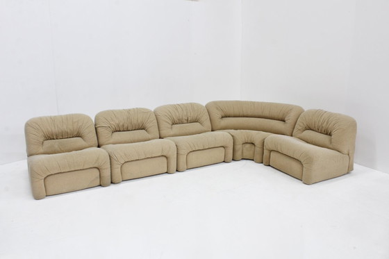 Canapé modulable vintage italien des années 1970, revêtu d'un magnifique tissu beige. Ce canapé se compose de 5 éléments, dont un angle. Son design arrondi est élégant et il offre un confort optimal. Il s'adapte à votre intérieur grâce à sa modularité : il suffit de déplacer les éléments selon vos envies.