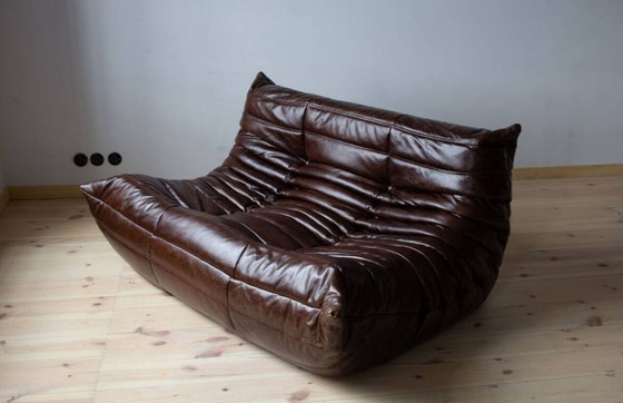 Canapé Togo 3 places en cuir marron, dessiné par Michel Ducaroy en 1973