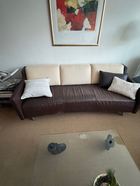 Découvrez l'élégance intemporelle du canapé 3 places Vintage Montis, modèle Meander. Ce canapé allie charme classique et confort moderne et s'intègre parfaitement à tous les intérieurs. Son revêtement en cuir marron respire le luxe, tandis que le dossier en textile beige/jaune offre un contraste subtil, mais ce dernier nécessite un remplacement.