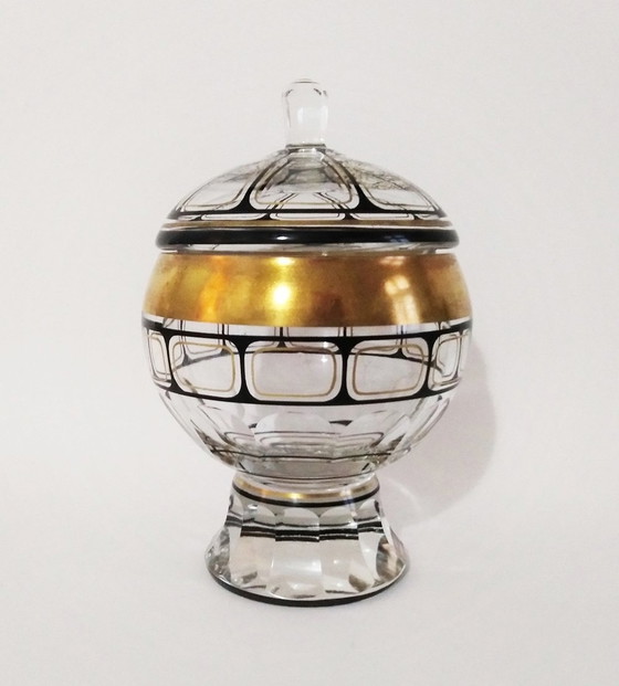 Carl Goldberg Haida art-deco faceted cut black-gold crystal lidded bonbonier 1920--16.5x11cm,700 grams, perfect condition--shipping in EU - 30€ worldwide - 55€ SHIPPING with priority express and registered post En tant que vendeur privé, je serai responsable de tout dommage à votre marchandise qui pourrait être causé par un emballage défectueux. Je ne suis pas responsable des dommages causés par la faute du transporteur, ni des colis perdus, etc. Selon les lois en vigueur dans l'Union européenne, la responsabilité de la livraison incombe à l'acheteur.