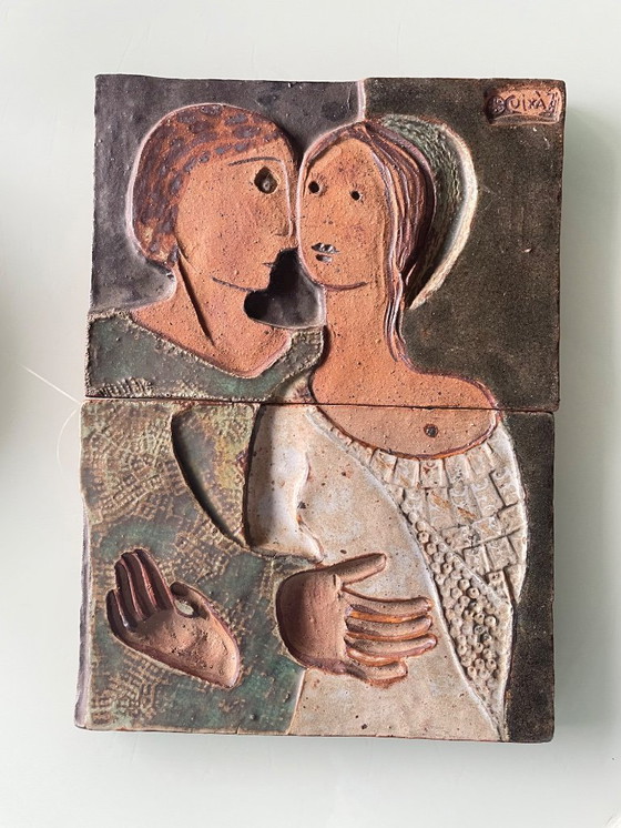 Carreau d'art mural figuratif moderniste en grès polychrome 1975