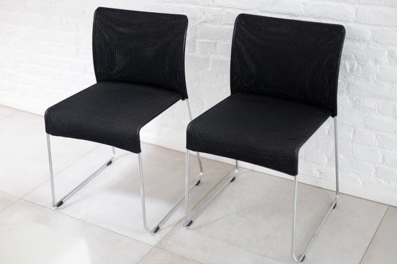 Chaises empilables avec piètement chromé et revêtement en polyester noir tissé en 3D. Neuves.