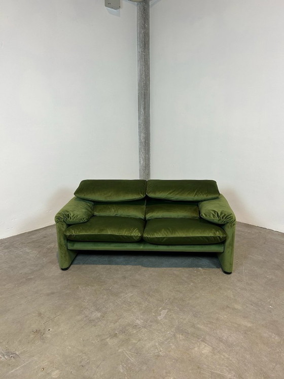 Icône du design italien, le canapé deux places Maralunga a été conçu par Vico Magistretti pour Cassina en 1973. Lauréat du Compasso d’Oro en 1979, il fait partie de la collection permanente du MoMA à New York, symbole d’innovation et de raffinement intemporels. Cet exemplaire, signé Cassina, mesure 168 cm (longueur) x 95 cm (profondeur) x 72/100 cm (hauteur, avec appui-tête réglable). Entièrement retapissé d’un élégant velours vert forêt, doux et lumineux, il a bénéficié d’une restauration professionnelle : structure renforcée, mécanismes fluides, coussins renouvelés avec de la mousse haute résilience et un rembourrage siliconé. Chaque détail, des tubes en acier inoxydable au piètement en satin, a retrouvé son éclat d’antan.