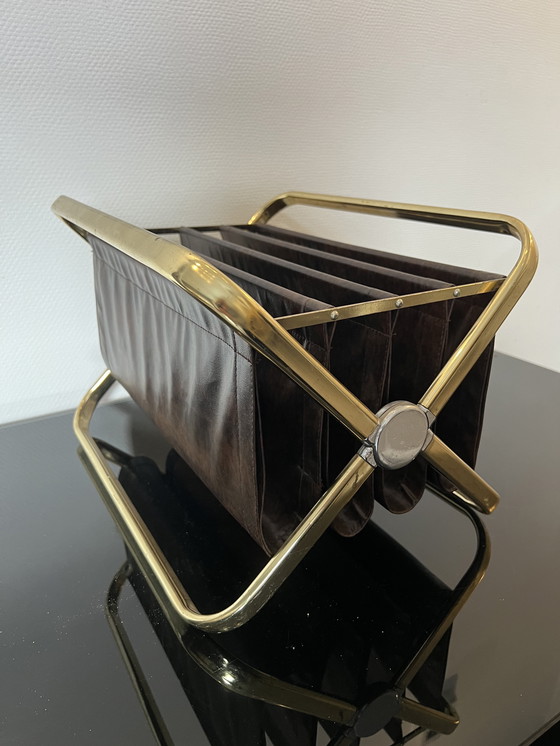 - Fabriqué avec une structure tubulaire en laiton et chrome, ce porte-revues est doté d'une carte suspendue en cuir skaï, alliant robustesse et style.