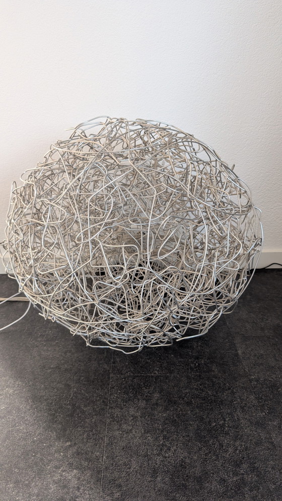 Le lampadaire iconique Fil de Fer Terra de Catellani & Smith, d'un diamètre de 60 cm, est composé d'un réseau raffiné de fils d'aluminium. Il est réputé pour sa lumière chaude et diffuse et son allure sculpturale.
