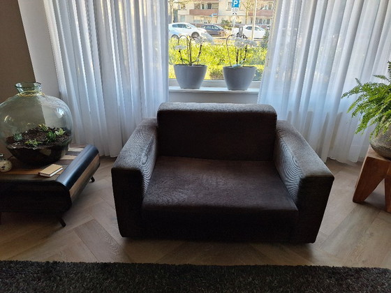Canapé deux places confortable et spacieux, dessiné par Jan des Bouvrie. Initialement blanc, il a été retapissé en raison de son aspect irrésistible.