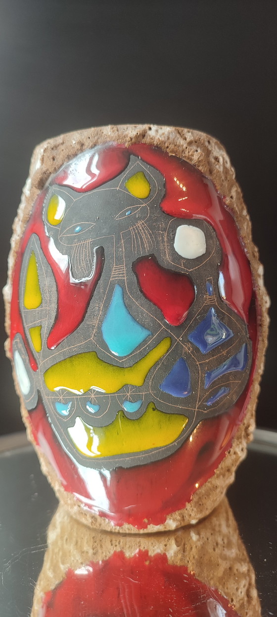 Décor Zoomorphe , représentation de son célèbre chat stylisé aux lignes géométriques, motif le plus recherché de l'artiste. Le médaillon central est réalisé avec la technique du sgraffito (incisions) et un émaillage cloisonné aux couleurs vives (rouge, jaune, bleu) légèrement en relief . Un contraste typique et sympa du décor et de l'anse émaillés brillants et le corps de la pièce brute "Fat Lava" .
