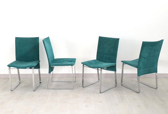 Ensemble de 04 chaises dans le style de Giovanni Offredi pour Saporiti, datant des années 70, production italienne. Les chaises ont une structure en acier et une assise en tissu velouté avec des motifs qui créent une texture "curieuse et vivante".