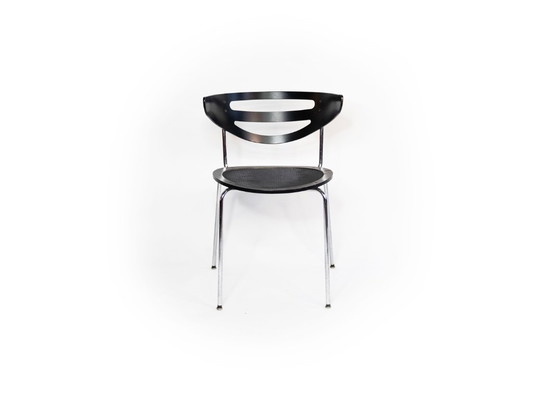 Cette chaise de style vintage, avec son élégante structure chromée et son dossier incurvé, attirera tous les regards dans votre intérieur. L'alliance d'une assise noire et d'une structure argentée lui confère un charme intemporel qui s'intègre harmonieusement aux intérieurs modernes comme classiques.
