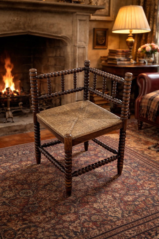 Charmant fauteuil d'angle ancien en bois, doté d'une assise en jonc tressé à la main et de détails décoratifs tournés à fuseaux. Élégant et rustique, ce meuble est conçu pour s'intégrer parfaitement dans un angle, optimisant ainsi l'espace et apportant une touche d'originalité.