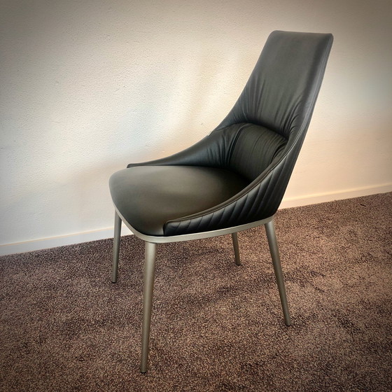 Ensemble de 4 chaises de salle à manger Eforma Sofia Elite. Ce lot comprend 4 chaises de salle à manger Sofia Elite de la marque italienne Eforma. Elles sont revêtues de cuir noir et possèdent un piètement en titane.