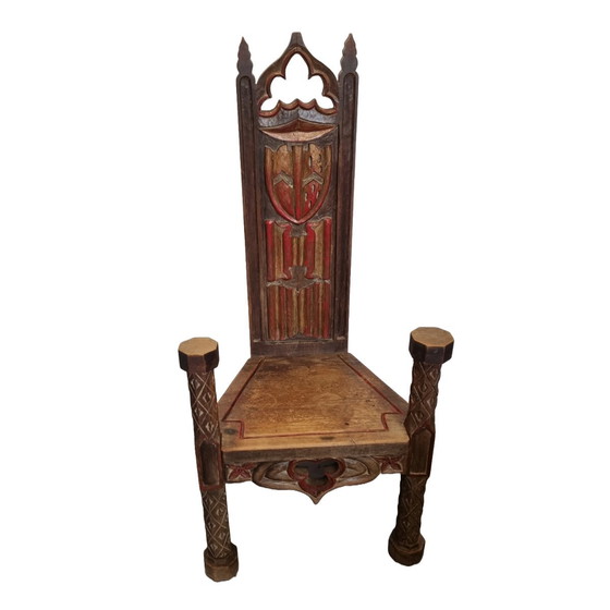 Chaise rare et unique, la chaise est faite à la main et vient d'Espagne. Marquée sur le dossier. D'après ses caractéristiques visuelles, en particulier le haut dossier avec des éléments architecturaux ecclésiastiques (arcs en ogive, ouvertures en forme de trifora) et le motif de bouclier sculpté, la chaise est clairement inspirée de la période gothique (approximativement du 12e au 16e siècle). Elle est en bois de Denne, première partie du 20e siècle. En bon état.