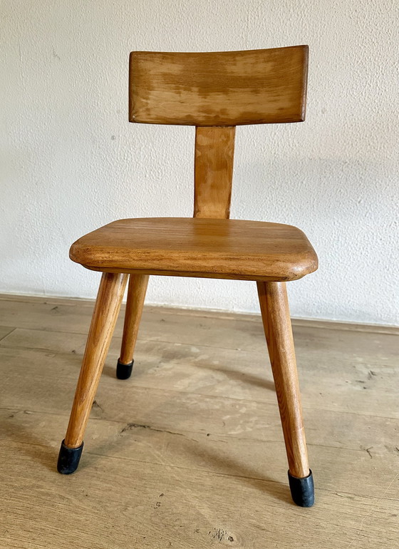 Adorable petite chaise en bois pour enfant, un classique des années 1960, fabriquée par l'usine de meubles Van de Woude à Veendam.