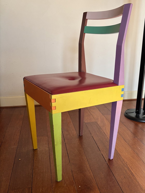 Apportez une touche de fantaisie à votre intérieur avec cette chaise Giorgetti unique, signée Massimo Morozzi. Avec ses couleurs vibrantes et ses lignes épurées, cette chaise attire tous les regards et séduira les amateurs de design moderne et audacieux.