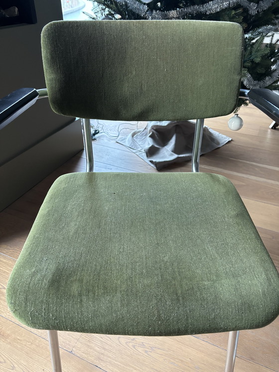 Chaise Gispen 1235 avec revêtement d'origine, structure en métal mat et étiquette de la marque. Le revêtement et le rembourrage sont à remplacer, mais la structure est en excellent état.