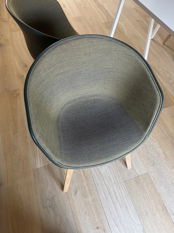 Quatre chaises AAC 22 de Hay sont à vendre. La coque est vert foncé et l'intérieur est recouvert d'un tissu chiné vert ocre. Le piètement est en chêne clair.