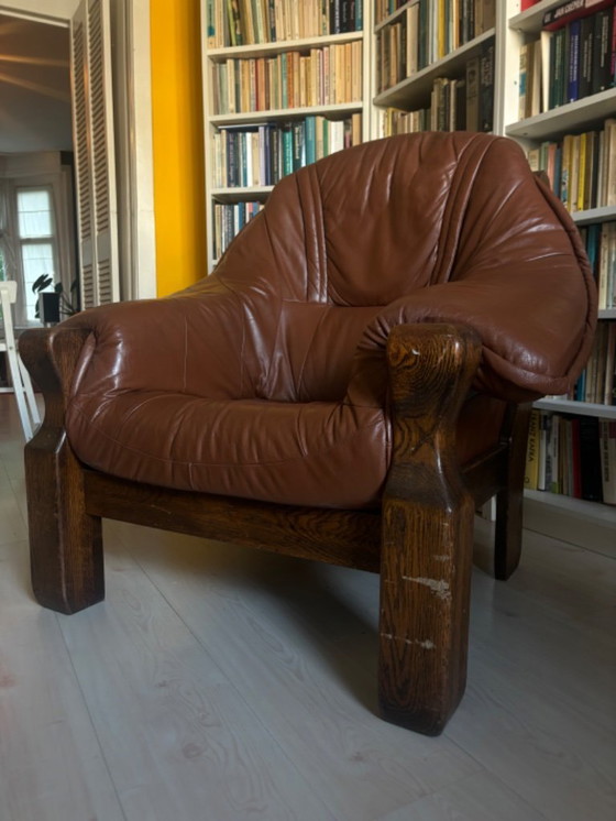 Chaise longue en cuir et chêne au design brutaliste 1970