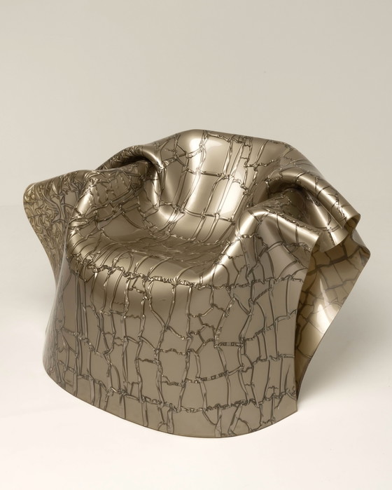 Cette chaise longue a été fabriquée par Karavco, une entreprise de meubles et d'accessoires d'ameublement. L'entreprise a mis au point un nouveau matériau, le panneau Karavco, qu'elle a utilisé pour prototyper plusieurs chaises longues, dont celle-ci. Les chaises sont façonnées manuellement, ce qui donne à chaque chaise un aspect légèrement différent. Les plis du panneau donnent l'impression qu'une couverture douce a été étendue sur la chaise, bien qu'il s'agisse d'une construction assez rigide. Le panneau Karavco a un côté brillant et un côté décoratif. C'est un matériau flexible qui possède de très bonnes qualités physiques et mécaniques, ce qui permet au designer d'explorer librement.