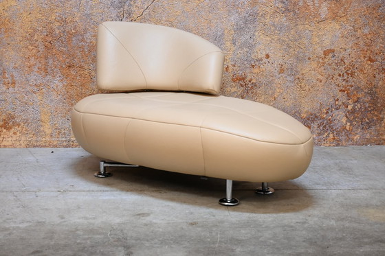 Une magnifique méridienne design de la prestigieuse marque néerlandaise Leolux, en superbe état. Son dossier pivotant permet de la transformer instantanément en fauteuil : deux en un ! Ce bel objet est revêtu de cuir beige (retapissé et quasiment neuf depuis).