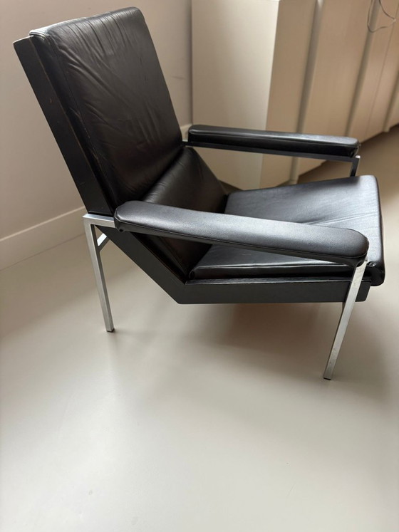 Fauteuil Lotus noir vintage (Rob Parry). L'assise et les accoudoirs ont été recouverts de similicuir, tandis que le dossier est en cuir d'origine. Très confortable, il s'intègre parfaitement dans un intérieur de style mid-century.