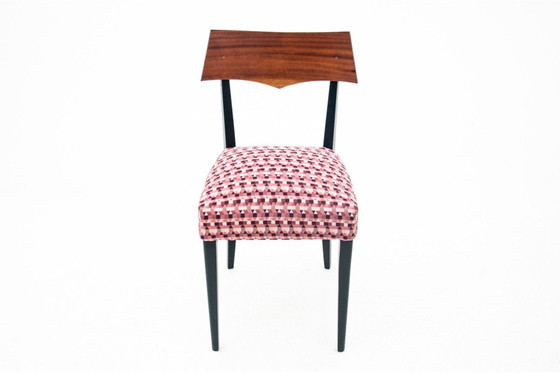 La chaise a un dossier profilé de forme inhabituelle. Le dossier est plaqué de noyer magnifiquement veiné. Les pieds de la chaise sont teintés en noir.
