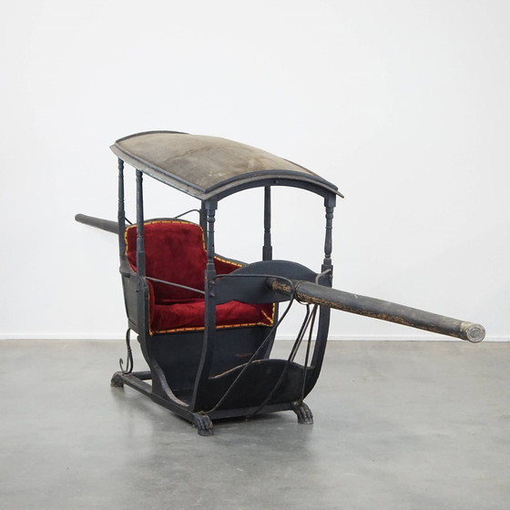 Nous vous proposons cette chaise à porteurs unique en taille réelle de la fin du 19e siècle avec des détails originaux étonnants. A quand remonte la dernière fois que vous avez vu une chaise à porteurs originale, sans parler d'une chaise à porteurs qui est également à vendre ? Cette belle chaise à porteurs ancienne est, selon toute probabilité, de style colonial hollandais et est en bon état d'origine. La tapisserie en velours rouge n'est probablement pas d'origine, mais elle est bien assortie. Hormis quelques signes normaux d'âge, la sellerie est en bon état. Les voitures de ce type étaient, croyez-le ou non, principalement utilisées pour transporter le propriétaire d'un côté à l'autre de la maison, c'est-à-dire à l'intérieur. Le chariot était probablement porté par quatre personnes. Cet objet décoratif étonnant est un ajout unique à votre collection privée ou dans un cadre professionnel tel qu'un hôtel ou un restaurant. Veuillez noter que les dimensions mentionnées dans le texte de notre annonce sont des dimensions indicatives. Les photos font partie de la description. Les objets anciens peuvent contenir d'anciennes traces de ver à bois. Dimensions : Hauteur : 129 cm Largeur : 394 cm Profondeur : 70 cm Hauteur de l'assise : 36 cm Profondeur de l'assise : 35 cm Numéro d'article : 24122403