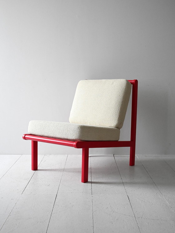 Chaise vintage avec un cadre rouge cerise et des coussins nouvellement rembourrés en tissu clair. Design audacieux et minimal.