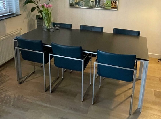 Les chaises ont une structure en métal et une assise en cuir de couleur pétrole (bleu-vert).