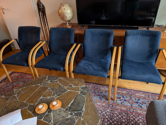 Ensemble de 4 chaises de salle à manger Leolux Cimarron en velours bleu marine. Chaises d'occasion en bon état et prêtes à l'emploi. Réputées pour leur confort et leur robustesse. Vendues uniquement en ensemble complet.