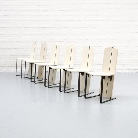 Ensemble de 6 chaises de salle à manger de style postmoderne des années 1980, Pays-Bas. Ces chaises sculpturales associent une assise en bois blanc crème à une structure en métal noir, créant ainsi un design épuré et saisissant.