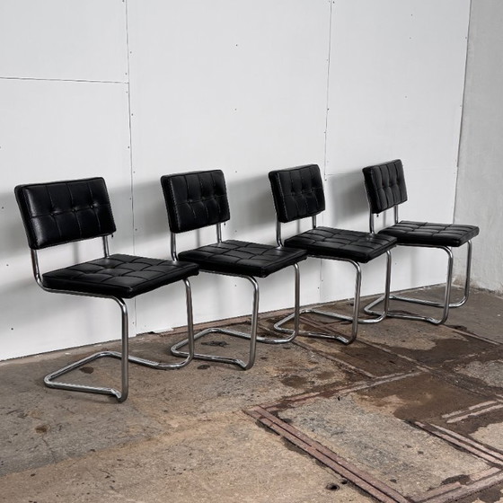 Ensemble de chaises empilables de style Cesca, avec structure tubulaire en acier et assise en cuir. Design robuste d'inspiration Bauhaus, à la fois pratique et durable. État vintage authentique : usure normale, sans défauts cachés. Ce sont des meubles fonctionnels, non de simples objets de décoration.