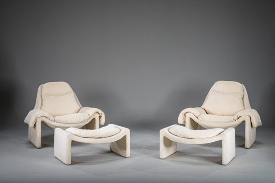 Rare ensemble assorti de deux chaises longues iconiques "Proposals P60" avec ottomans, conçues par Vittorio Introini pour Saporiti Italia. Cette paire est un excellent exemple du design italien de l'âge de l'espace des années 1960, avec une silhouette audacieuse et minimaliste.