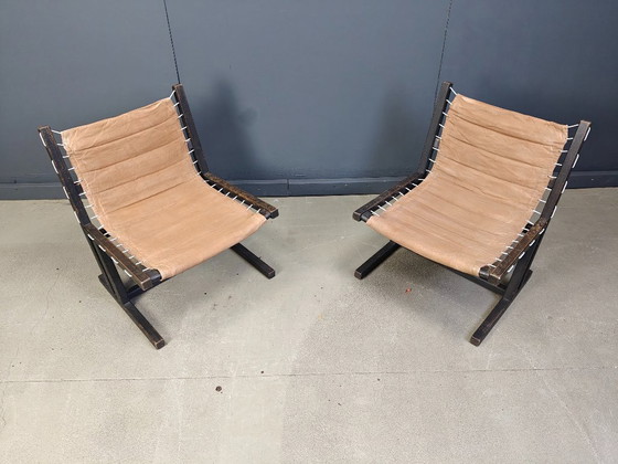 Fauteuils Safari des années 70 en toile et bois noirci par Casala.