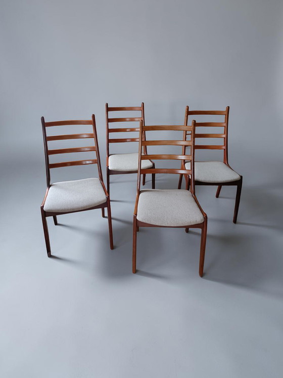 Magnifique ensemble de quatre chaises de salle à manger danoises à dossier échelle, datant des années 1950/60. Conçues par Kai Kristiansen et fabriquées par Schou Andersen au Danemark (estampille présente sous l'assise).