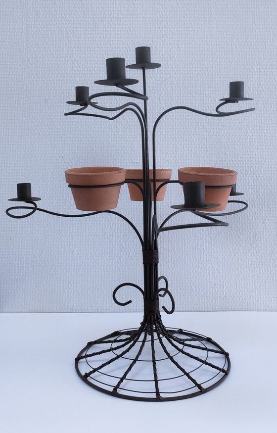 chandelier à sept feux de lumière en métal et trois pots en terre cuite.