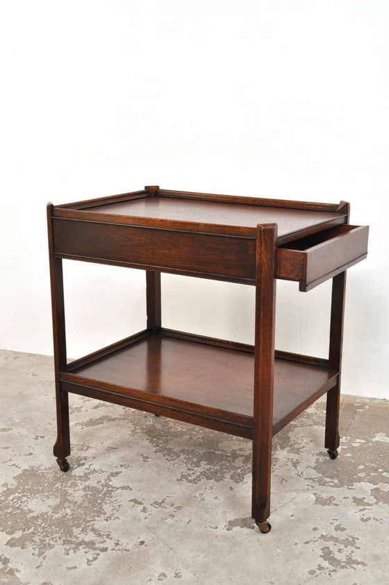 Magnifique desserte en chêne des années 1920, montée sur quatre roulettes pivotantes et dotée d'un grand tiroir. Vous l'imaginez déjà, vos boissons (alcoolisées ou non) à portée de main ?