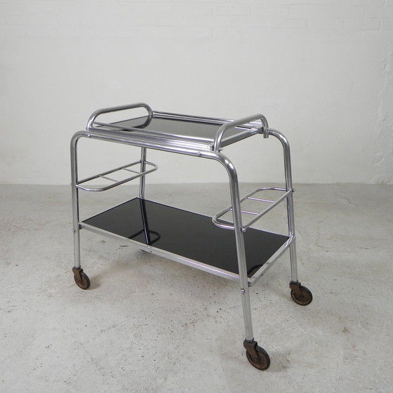 Hauteur : 70 cm. Largeur : 76 cm. Profondeur : 40 cm. Le chariot de service est équipé de roulettes. Le plateau est posé sur le dessus. Dimensions plateau : 34 x 50 cm. Origine : France, années 1930. Matériau : aluminium, verre laqué noir.